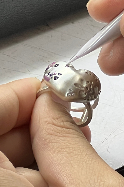 Jedes Schmuckstück beginnt mit einer gestischen Idee, einer Auseinandersetzung mit Form, Komposition und Gefühl. Die Emaille wird behutsam aufgebaut und entwickelt feine Übergänge und Texturen, die lebendig und ausdrucksstark wirken. So erhält jedes Schmuckstück eine eigene, unverwechselbare Note.